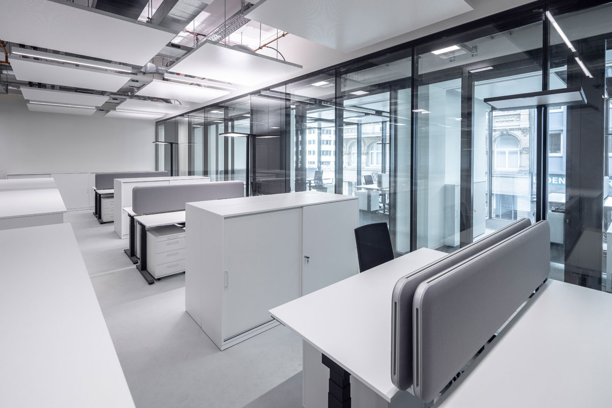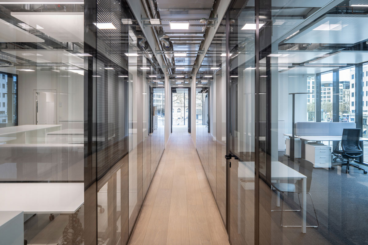 Zu Gunsten einer räumlich großzügigeren und zeitgemäßen Großraum-Büronutzung und einer kleineren Anzahl von Rückzugsbüros und Besprechungsräumen wurden hierzu die bisherigen Zellenbüros im 2. – 15. Obergeschoss umgebaut, so dass eine BGF von ca. 625 m² je Geschoss als eine zusammenhängende Nutzungseinheit entstanden ist.